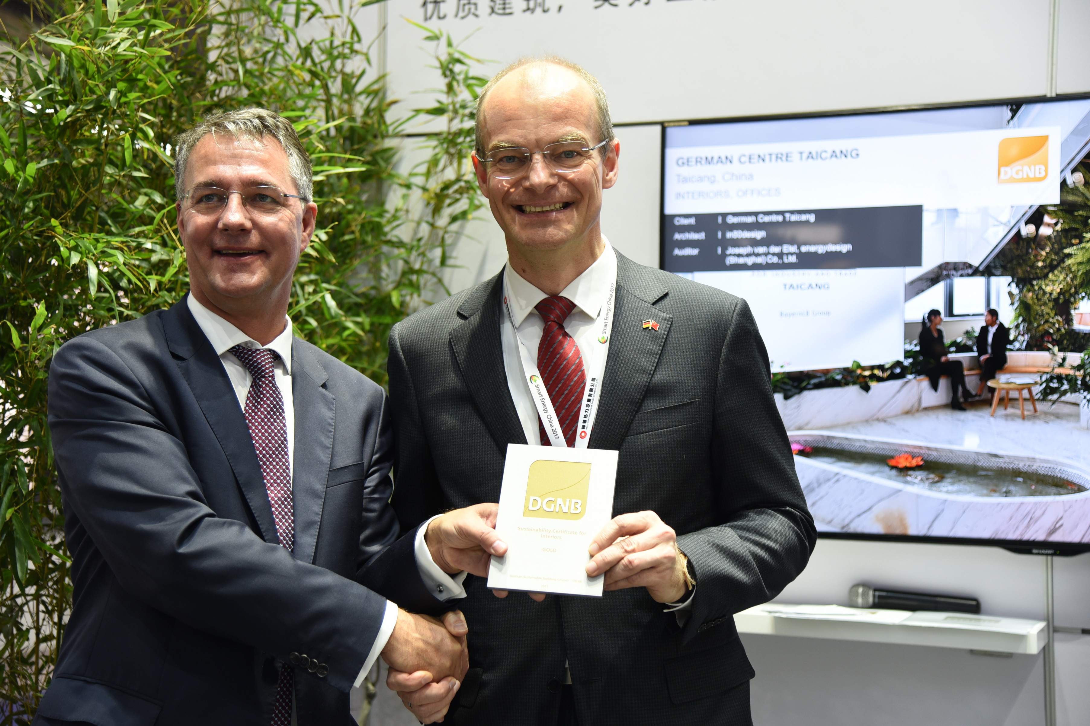 由设能公司担任顾问的太仓德国中心DGNB金奖颁奖仪式在同一天举行。德国联邦国务秘书君特·阿德勒Gunther Adler代表德国联邦政府,德国中心(上海)的总经理Christian Sommer夏建安先生作为业主代表参加了此次颁奖典礼,从设能公司DGNB顾问Hans Niemann手中接过了认证奖牌。德国DGNB的总监Stefan Anders代表DGNB机构出席颁奖仪式。